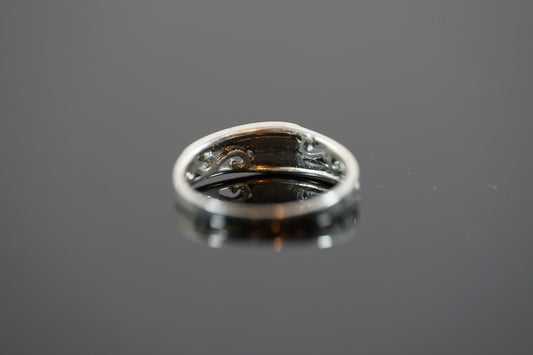 Silver Ring With Intrecate Band Design And Two Gemstones
